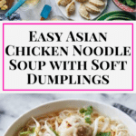 A comforting and aromatic Asian-inspired chicken noodle soup featuring tender shredded chicken, soft egg noodles, and fluffy homemade dumplings simmered in a flavorful ginger-garlic soy broth.