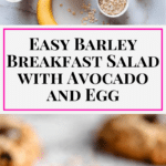 A hearty and wholesome savory breakfast salad featuring chewy cooked barley, creamy avocado slices, and perfectly cooked eggs, dressed with a light lemon and olive oil vinaigrette. This dish offers a nutritious start to the day with balanced protein, healthy fats, and whole grains.