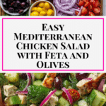 This chicken Mediterranean salad is a fresh and vibrant dish featuring juicy seasoned chicken breast paired with crisp romaine lettuce, cherry tomatoes, cucumbers, red onion, Kalamata olives, and creamy feta cheese, all tossed in a simple lemon-olive oil dressing. It’s a healthy, colorful meal perfect for lunch or dinner that brings bold Mediterranean flavors to your table.