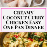This Coconut Curry Chicken recipe features tender chicken simmered in a rich and creamy coconut milk curry sauce, infused with warm spices like curry powder, cumin, turmeric, and paprika. It’s an easy one-pan stovetop meal bursting with bold flavors and comforting warmth, perfect served over rice or with naan bread.