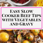 Tender slow cooker beef tips simmered in a rich brown gravy with potatoes, carrots, onions, and optional mushrooms. This comforting crockpot dinner is hearty, flavorful, and perfect for busy weeknights or cozy weekend meals.
